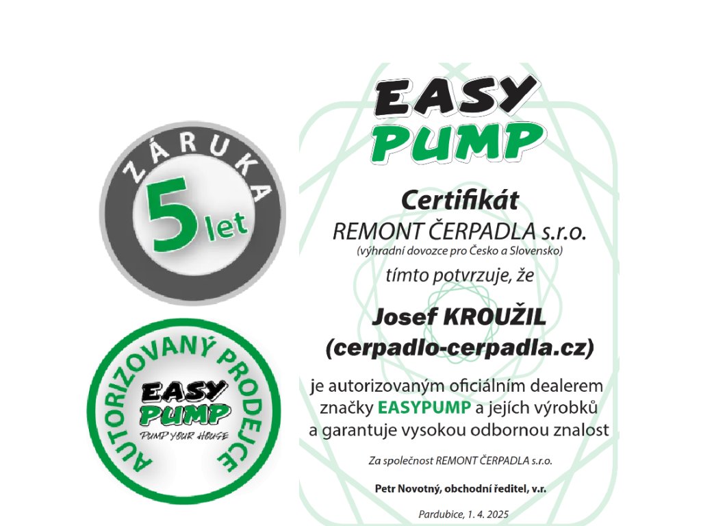 + ZÁRUKA 5 let platí pouze při nákupu v eshopu cerpadlo-cerpadla.cz. Jsme autorizovaný prodejce EASYPUMP.